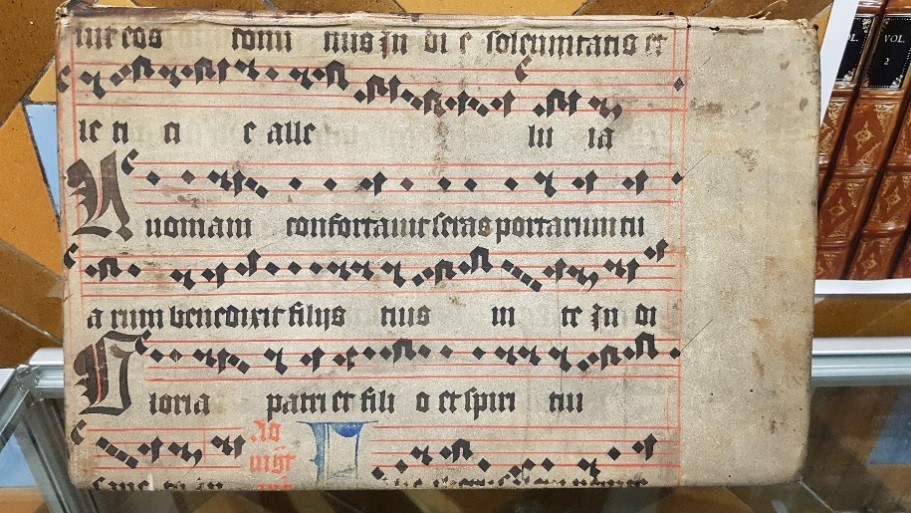Here can be seen on the Leeds copy of the Arbor Aniciana – just such an example of re-cycling where a page from a medieval Psalter containing musical notations, Gloria patri’s and so on has been used as a dust jacket to help protect the original binding of the book.