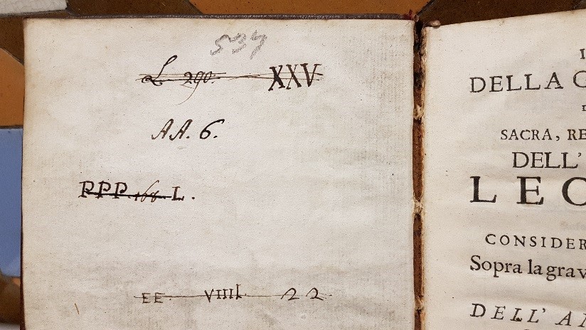 A sales catalogue clipping inside the front cover of the book suggests that this book was originally kept in the library of the Pope. It is likely then to have been part of the great Albani Library of Urbino and Rome which was largely the creation of Pope Clement XI. Upon the death of the last of the Albani family in 1852 the library whose printed books at that time numbered some thirty five thousand began to be broken up and sold. In 1857 some twenty thousand of these came up for auction in Rome. It is possible that our copy was one of these however, what happened to the book between then and 1939 when it was acquired by Leeds Central Library remains a mystery for the present. One further mystery may possibly be solved by a reader of this article. One of the flyleaves at the front of the book contains a number of classmarks that had been used at one point or another throughout the book’s life. Perhaps these give us a clue as to the book’s whereabouts since it was published in 1677.