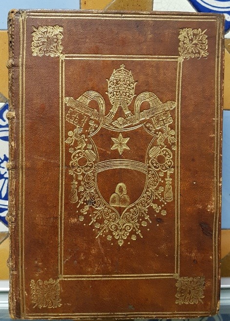 The binding of this book is an excellent example of 17th century Italian work. The front cover bears the coat of arms of Pope Clement XI. His original name was Gianfrancesco Albani (1649-1721) who was a patron of the arts and science and a great benefactor of the Vatican Library.