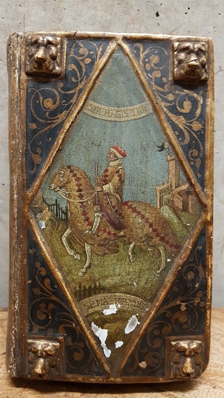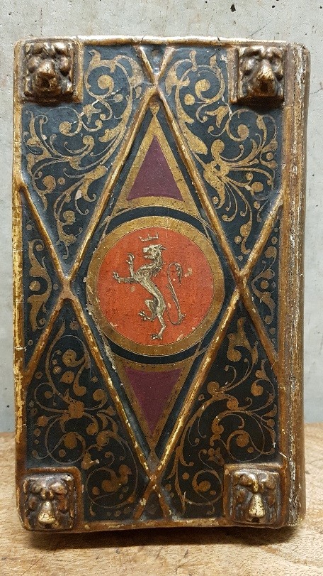 It is believed that this is an example of one of Icilio Federico Joni’s forged bookbindings. He painted wooden boards, used to cover the Tavole di Biccherna, the elaborately gilt and painted fourteenth-century Sienese tax registers. Joni was an Italian painter and counterfeiter, a highly celebrated self-professed forger whose speciality was as a counterfeiter of ancient paintings. Based in Siena, his birthplace, he was the head of a ‘school of forgers’ who specialized in reproducing imitations of old masters on bookbindings.