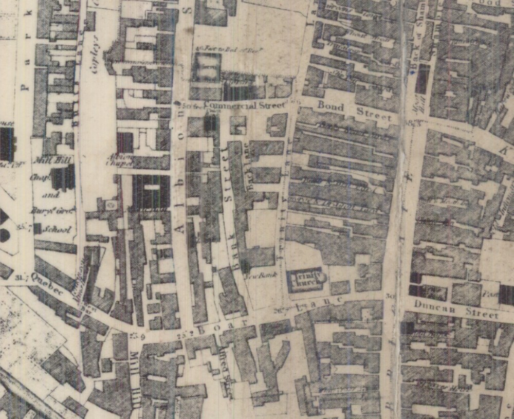 One of the first references to a circus on Boar Lane was for Mr Adam’s New and Elegant Circus, near the Lancastrian School, in 1816. The Lancastrian School was on Alfred Street, just off Boar Lane. Cooke’s Olympic Pavilion opened in June 1822 and Cooke regularly presented performances at this venue for the next twenty years. The circus was often rebuilt and in February 1841 it was announced that there would be the ‘erection of a spacious circus on the vacant ground between Trinity Street and Bank Street … for the use of Mr Cooke’s superior equestrian stud’ (see map above). The other two streets bordering this plot of land were Commercial Street and Boar Lane; the main entrance being on Boar Lane. Many other circus companies used this site through to the 1860s; Batty’s New Circus Royal; Franconi’s Cirque National de France (the Franconi’s were the ‘founding fathers’ of the French circus); Pablo Fanque’s Royal Circus; Bell’s Great United Hippodrome and Circus; and Sanger’s Grand Circus.