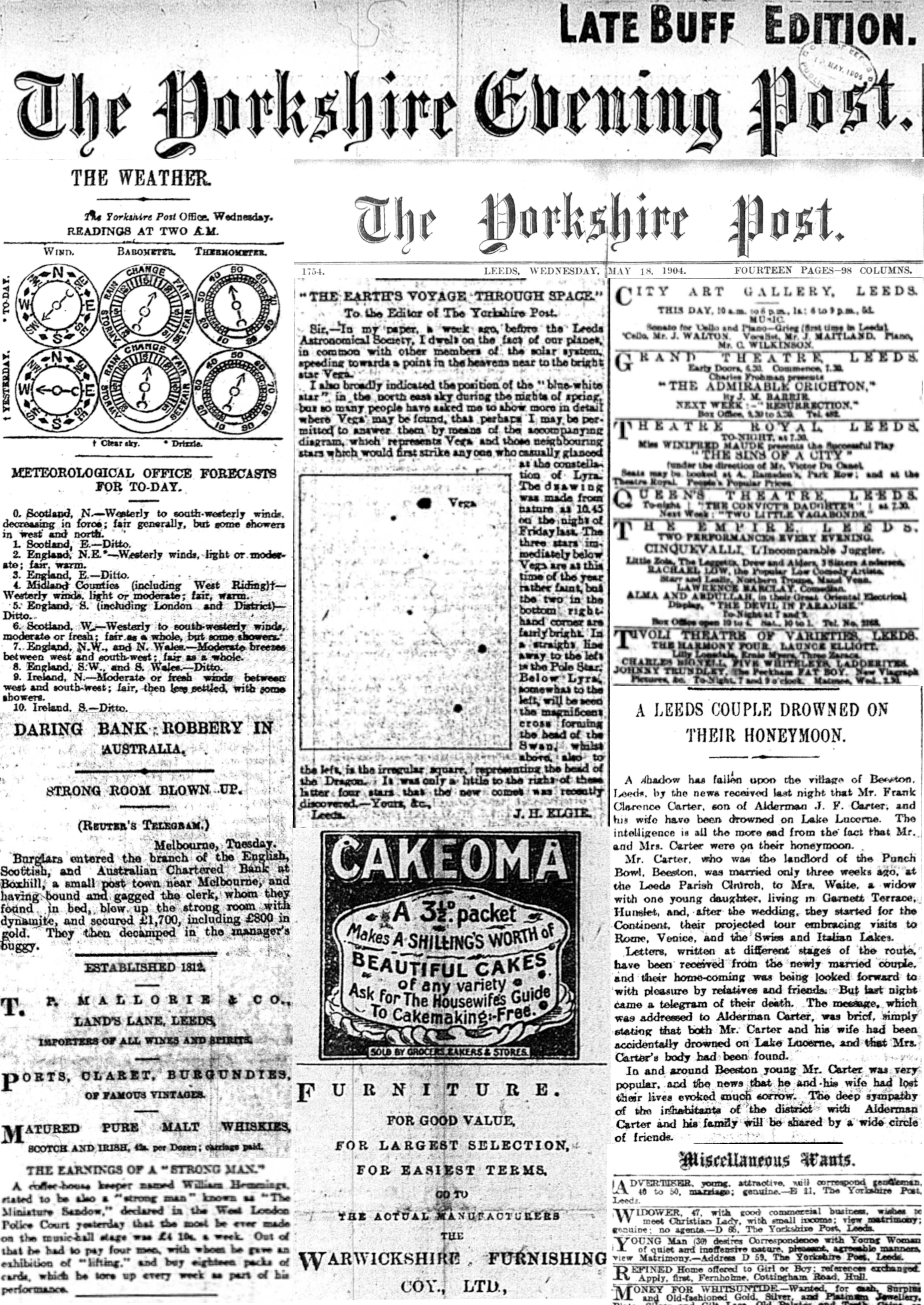 Today’s edition, hot off the press: 18th May 1904. J H Elgie fills us in on the night sky, a young gentleman of 30 wishes to correspond with a quiet and inoffensive young woman, and be sure to secure a ticket for famous German juggler, Paul Cinqueville, down at The Empire Theatre—box office opens at 10am.