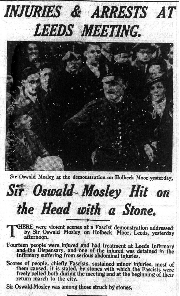 The Blackshirts had to use the police, located on Holbeck Moor, to move to where the speeches were taking place. The speeches took place around a van which Mosley climbed on top of to speak to the crowd. These protesters surrounded the van and sang the Red Flag in order to drown out Mosley’s speech and many threw stones at the Fascists. Mosley was reportedly dodging stones while speaking to the crowd. The excitement and danger grew as the police started to arrest protesters who were throwing stones, Mosley continued to speak during the confrontation. Finally, the Fascist’s knowing that they were greatly outnumbered retreated with great difficulty from Holbeck Moor, with forty Fascists being injured from the stones, including their leader Oswald Mosley who was hit in the temple by a large stone. The injured Fascists were treated in St Matthew’s School next to Holbeck Moor.