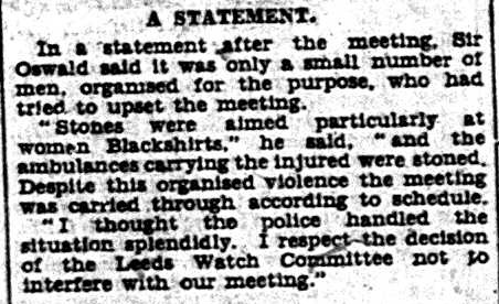 Oswald Mosley saw industrial Leeds as the perfect place to mobilise support for his Fascist group and organised a rally at Holbeck Moor. Mosley used these events to gain more support for his Fascist Blackshirt supporters. These Fascist marches and events were notorious for stoking up anti-Semitism in cities. This concern caused the Leeds City Watch Committee to forbid Mosley and his British Union of Fascists from marching through the Leylands Jewish quarter of Leeds. Despite the ban the night before the event many Jewish shops were targeted with swastikas and anti-Semitic acts of vandalism. However, the Labour and Communist Parties in Leeds were very popular and they decided to organise a strong protest against the Fascists.