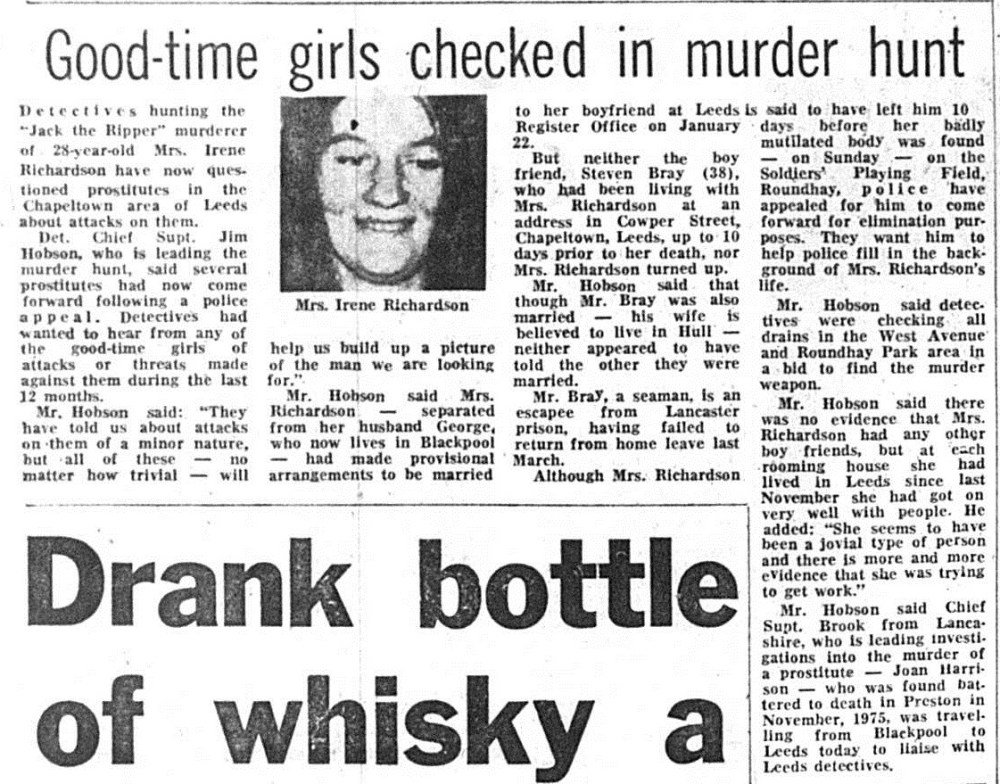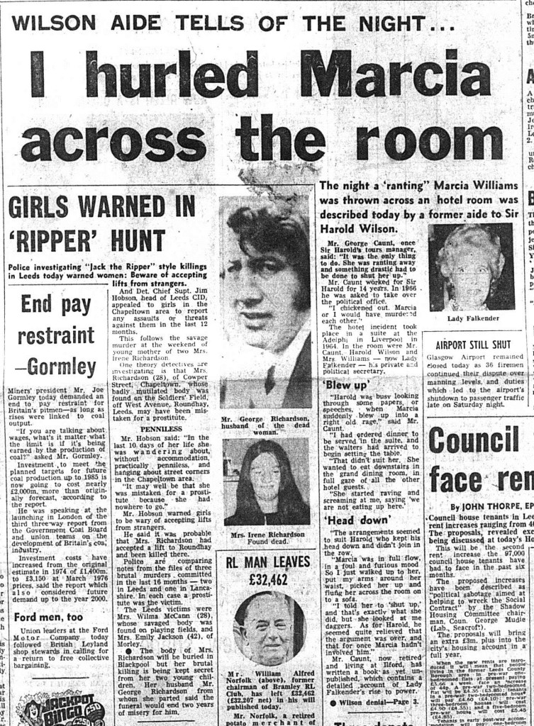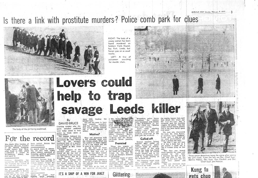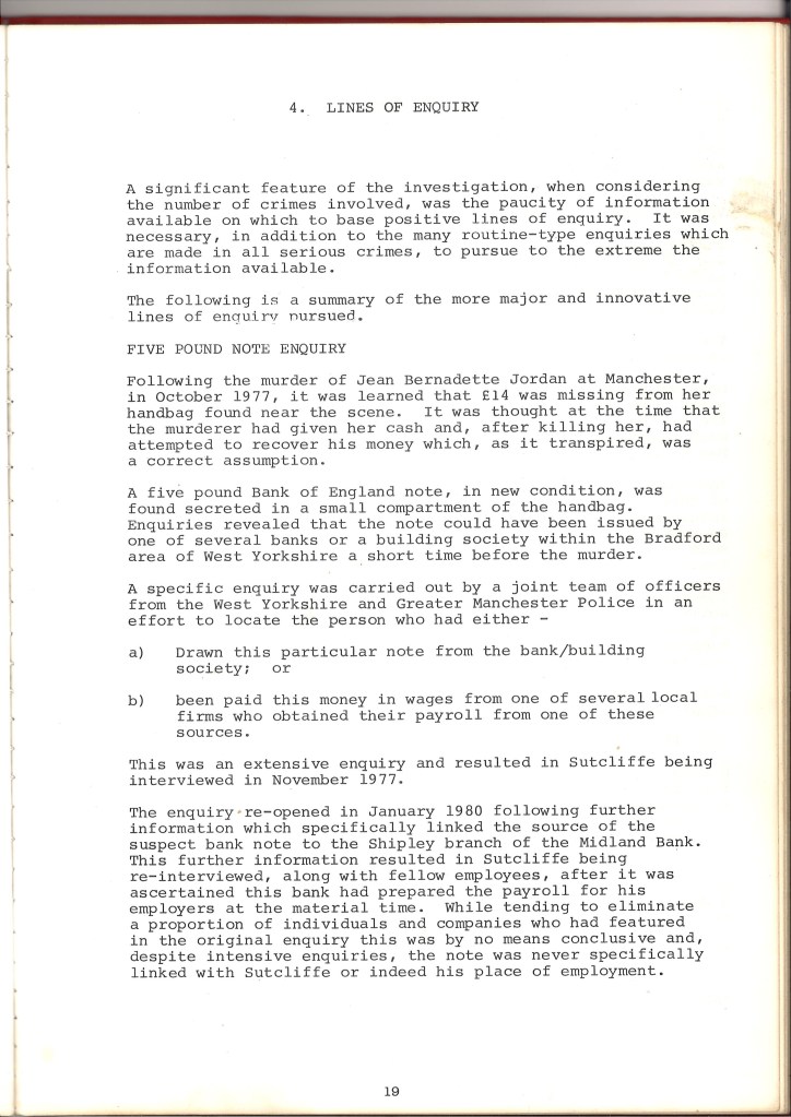 And yet, whilst Sampson highlights many of the same problems as Byford, his analysis of these issues is often less thorough than Byford’s. Both Byford and Sampson cite the £5 note investigation in their reports, during which police worked with local firms and banks to identify a note left at the scene of one of the murders. Sampson maintains that police faced considerable obstacles in tracing the note and were unfairly criticised by the press: ‘to be one of nearly 6,000 persons who could have received the £5 note is not the ‘miraculous escape’ as suggested by the media’. And yet Byford states that further enquiries narrowed down the list of individuals to ‘a readily manageable 241’ – a different impression to the one provided by Sampson’s summary. Both Sampson and Byford are critical of media reporting on the case, and suggest the use of press officers in future cases. Nonetheless, Byford argues that some aspects of media speculation were justified, a point which is not raised by Sampson. Jacqueline Hill was attacked by Sutcliffe at around 10pm; her blood-spattered handbag was found shortly afterwards and handed to police, who did a cursory search but failed to identify other possessions left at the scene. When Jacqueline’s body was found the following morning, media reports questioned whether she might have survived if police had searched more thoroughly – speculation that is described by Byford as ‘perfectly proper’.