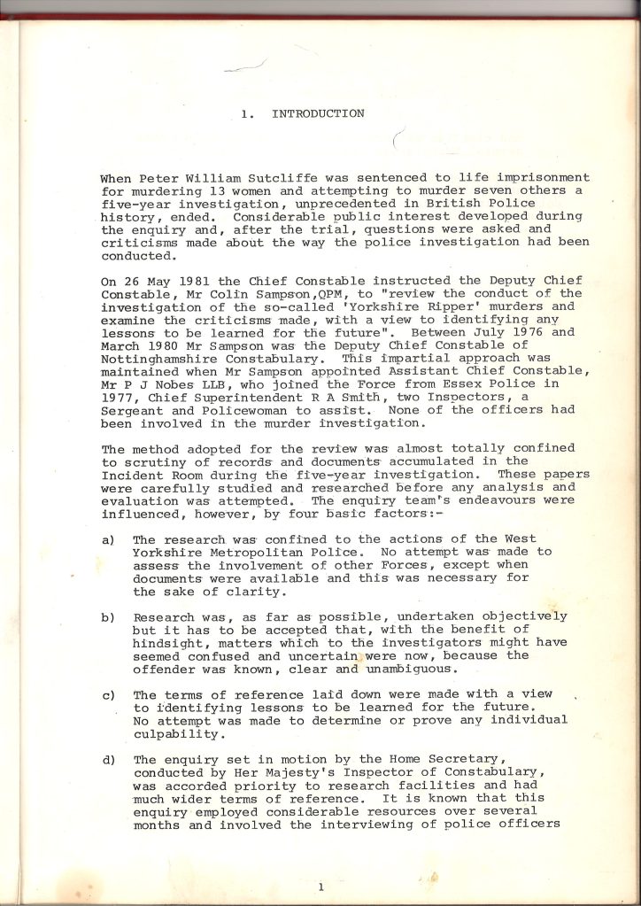 Criticism may have been hard to swallow, but the failings of the investigation could not go unanswered. In 1981 the Home Office ordered the Chief Inspector of Constabulary, Lawrence Byford, to lead an official inquiry into the Ripper investigation. The report remains one of the most comprehensive analyses of the case, recommending practical changes to police methods – the standardisation of indexing procedures in police incident rooms, better communication between forces, and the computerisation of records. The Byford Report, however, was not the only analysis of the Ripper case to be published in the immediate aftermath. In Leeds Central Library, an unassuming typewritten document bound in red cardboard also sheds light on the case. The document is titled Report into the Investigation of the Series of Murders and Assaults on Women in the North of England between 1975 and 1980, and is a summary of a 1981 internal review of the investigation carried out by the Deputy Chief Constable of Nottinghamshire Constabulary, Colin Sampson. The words ‘internal review’ raises an obvious question: as Chief Inspector of Constabulary, Lawrence Byford was responsible for investigating police failures across the UK and was ultimately answerable to UK Parliament. By contrast, we might wonder whether an internal report – even one conducted by the chief of another force – could be as impartial. How do the reports compare?