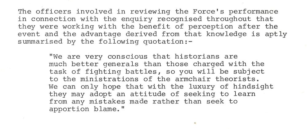 None of which is to suggest that Sampson’s report is a whitewash. Byford and Sampson largely concur on the major flaws in the investigation, and it should be remembered that the document held in Leeds Central Library is only a summary (the full report has not been published, and would have to be requested from the Home Office under Freedom of Information laws) and Sampson was not provided with the same resources afforded to Byford. Nonetheless, there are points even in the summary of Sampson’s report where he does not probe as deeply as we might expect: Sampson writes, for example, that ‘despite extensive enquiries, the note was never specifically linked with Sutcliffe or his place of employment’. The question of whether it should have been, given Byford’s mention of a revised list including only 241 employees, is not asked. Similarly, he maintains that ‘the value of the Photofits, except the three from the survivors, was limited because it was never certain if the man was the one concerned or not’ – an explanation that seems somewhat too easy given his own statement elsewhere in the report that eyewitness accounts, whilst far from infallible, should have been given greater emphasis.