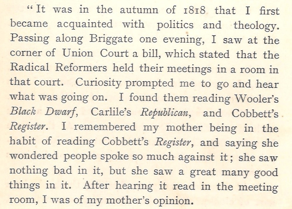 Leeds was second only to Manchester as a hot-bed of early 19th-century political radicalism. In his autobiography, James Watson records attending a meeting of Radical Reformers at Union Court off Briggate in the Autumn of 1818.