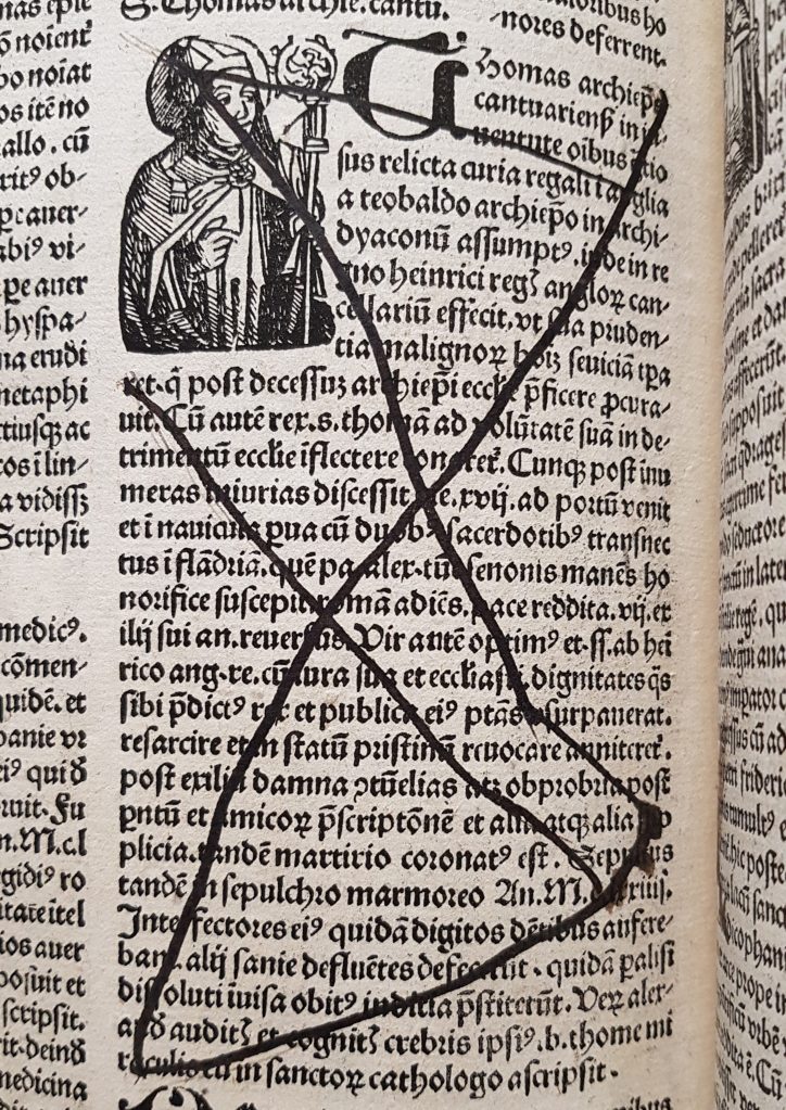 The image above shows the page where a reader censored the image of Thomas Becket, Archbishop of Canterbury (1118-1170). Having been the most venerated saint in pre-Reformation England, as well as the then-King’s rival, the image of Thomas Becket was immediately attacked by Henry VIII after his break with Rome. In 1538, Henry ordered the destruction of Becket’s shrine, the banning of his ‘festival’, and the erasing of his name and images from ‘all the books’. In this copy, a reader might have crossed out the section on Thomas Becket violently in compliance with Henry’s decree, but probably also because of his own Protestant enmity towards ‘false’ saints and cults.