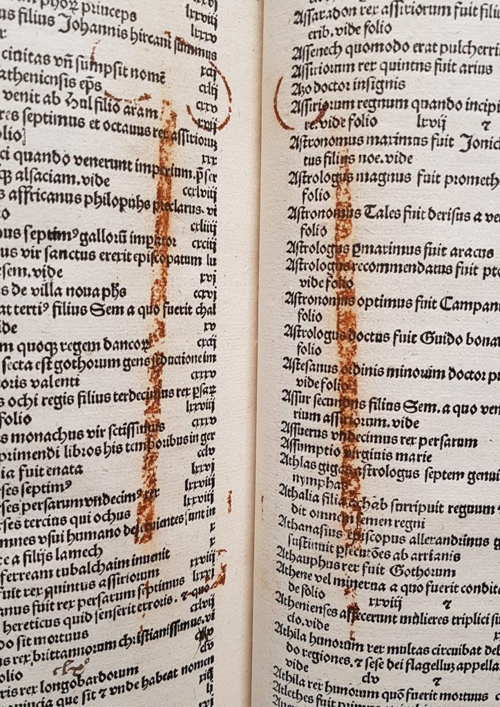 However, this is the only marginal note in this copy of the Chronicle, which reveals anti-Catholic sentiments so straightforwardly. The identified readers of the book, late 16th century English gentry or yeomen families (the Chaffyns of Seals in Wiltshire, James Langrake, and Thomas Doggett) annotated the book only slightly. They left confusing ownership inscriptions, a few notes in English, a psalm, a complaint by Thomas Doggett about being kept for 12 days at someone’s ‘porter’s lodge’ and, finally, a rusty imprint of a key, which probably served as a bookmark (see image above). Almost all notes are made in English, which makes us wonder if these readers knew enough Latin to understand the meaning of the Chronicle’s text. Therefore, this copy of the Chronicle’s presents a fascinating example of how a Latin book would be used and treated by ‘unlearned’ readers from minor gentry families in the late 16th century, who apparently cherished this book and carefully passed it through generations in their families.
