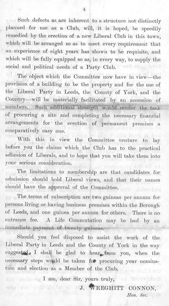 Such magnitude of effort was testament to the position held by the Liberal Party during the 19th-century, and the sheer number of members and volunteers who could be corralled to contribute to the completion of the new club-house. At our remove, however, the opening of the Quebec Street venue perhaps marks the culmination of the Liberal project in Leeds, at the cusp of a very-different political world in the region and the nation; 1906 marking the final time the Party had a majority in the local Council and 1922 the last Liberal M.P. elected for Leeds. Even so, the building – which survives, albeit with a somewhat different purpose – still stands today as an emblem of the role played by the Liberal Party in the development of 19th-century Leeds.