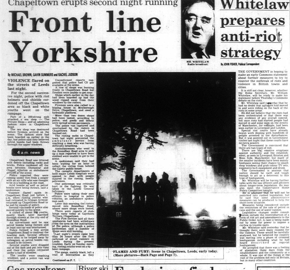 When we use the term ‘riot’ to describe the events of July 1981, in Chapeltown, Leeds, it comes loaded with connotations. For sociologist Max Farrar, rioting means ‘losing it big time’ (Farrar, ‘Rioting of Protesting? Losing It or Finding It?’ p.25). ‘It’ here being the loss of order. It conveys a sense of mindlessness perpetrated by a mob mentality – chaos, rebellion, violence. The government, typified by Prime Minister Margaret Thatcher, denounced the summer uprising in Lambeth as ‘criminal,’ and further argued in relation to the wider series of uprisings that ‘nothing but nothing justifies what happened on Saturday and Sunday nights’ (Benyon, Scarman and After: Essays Reflecting on Lord Scarman’s Report, p.13). This characterisation of the events fits with an image of rioting as meaningless, and more importantly, illegitimate.