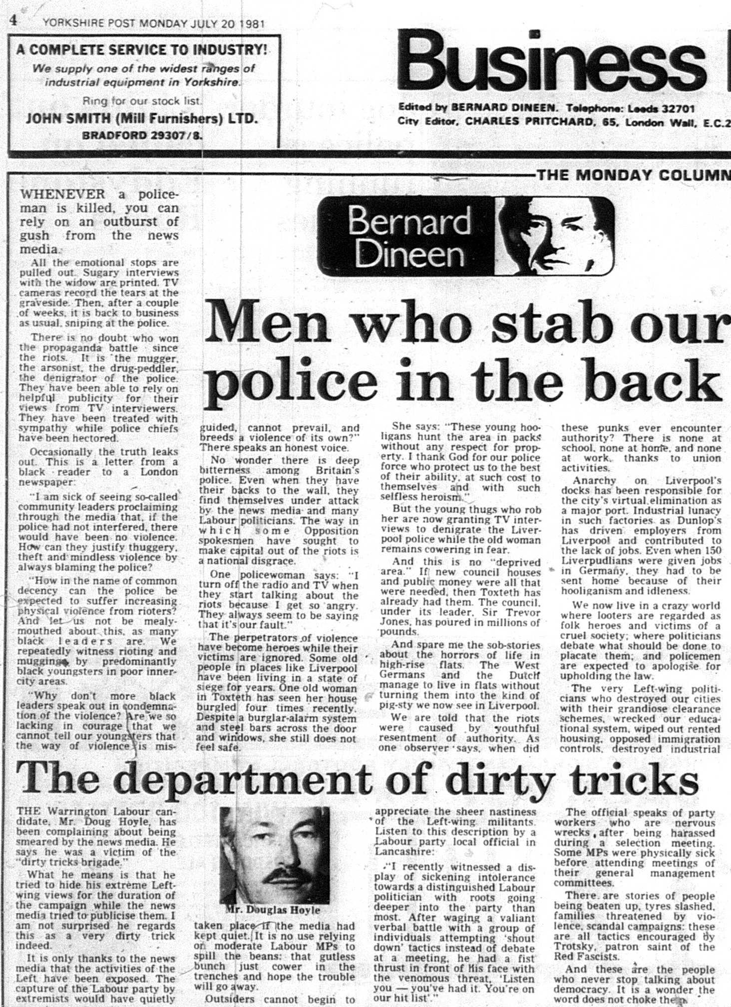 The presence of Black people at the ‘riots’ meant that events were immediately racialized. In the reporting of events, ‘hooligans’ became ‘Black hooligans’ and ‘mobs’ became ‘race mobs’ (Murdock, Scarman and After: Essays Reflecting on Lord Scarman’s Report, p. 82). Following the events in Chapeltown, Bernard Dineen’s comment piece in the Yorkshire Post stated, ‘we repeatedly witness rioting and mugging by predominantly black youngsters in poor inner-city areas’ (Yorkshire Post, July 20 1981). The term ‘riot’ – its connotations of mindless violence, savagery, and sprees of criminality – played to an already established picture of the threat Black people posed.
