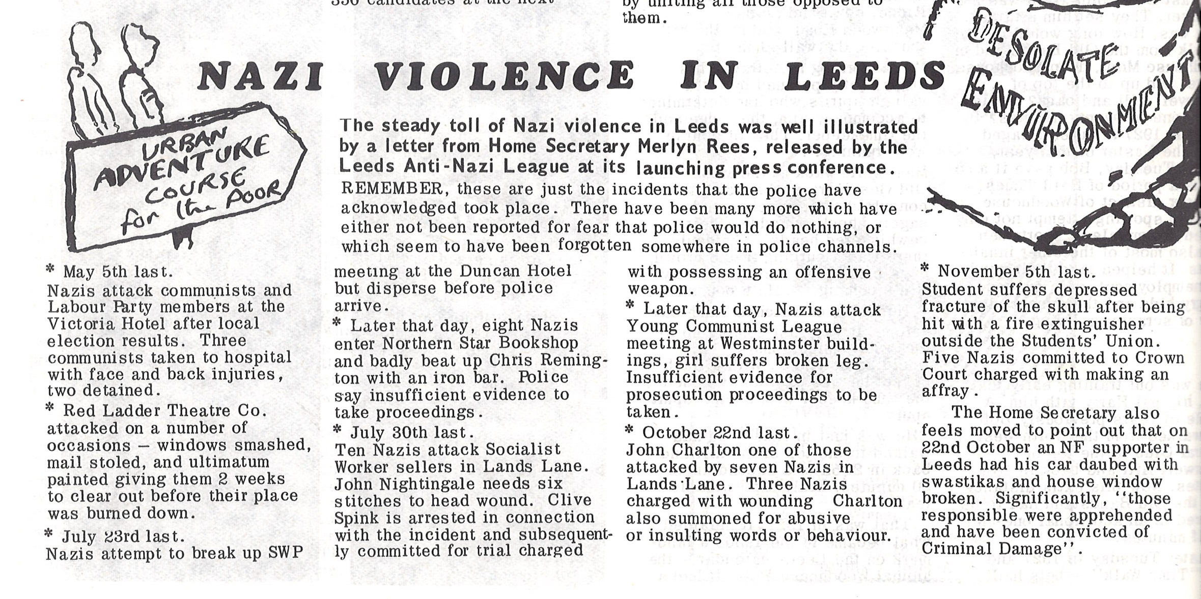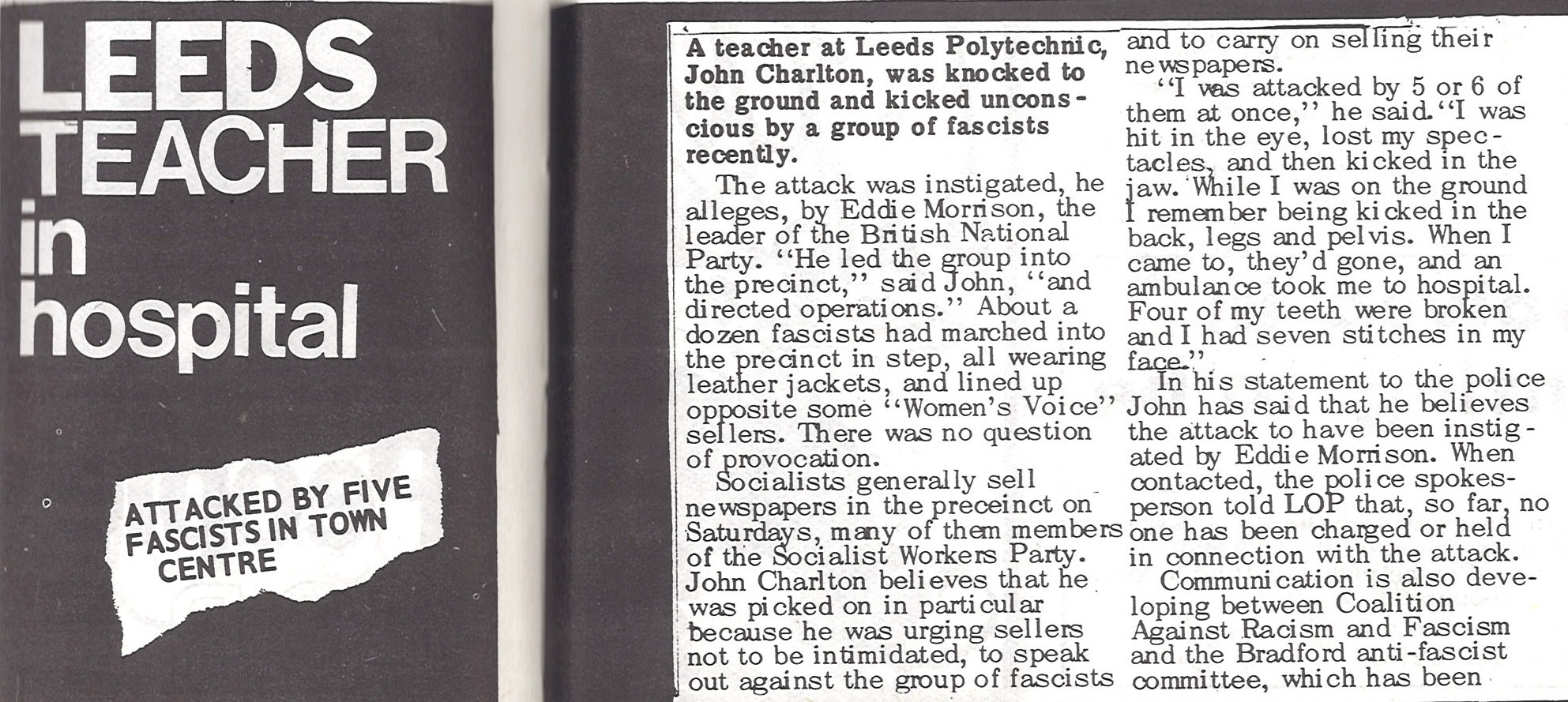 Much of this violence was led by Eddy Morrison, a far-right activist who makes frequent appearances in the LOP during the ’70s, including involvement in an attack on John Charlton, a teacher at Leeds Polytechnic (now Leeds Beckett University). Charlton was “knocked to the ground and kicked unconscious by a group of fascists…[i]nstigated…[b]y Eddie Morrison” in October of 1978, after standing up to five men intimidating sellers of the Women’s Voice magazine on Land’s Lane.