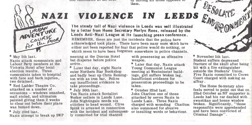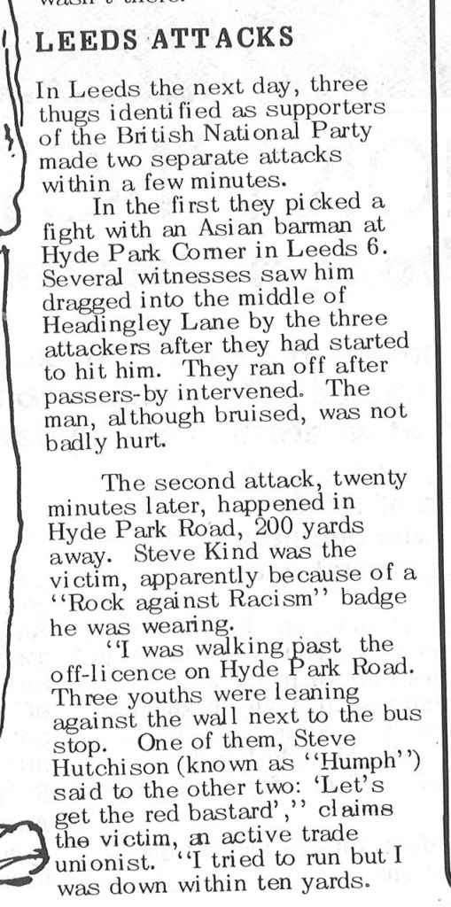 The violence and viciousness referenced above had only intensified by the second half of the decade. The Leeds Other Paper (LOP) – the city’s alternative newspaper, launched in 1974 and designed “to support all groups active in industry and elsewhere for greater control of their own lives” – featured regular reports of such incidents, such as this typical account from 1978: