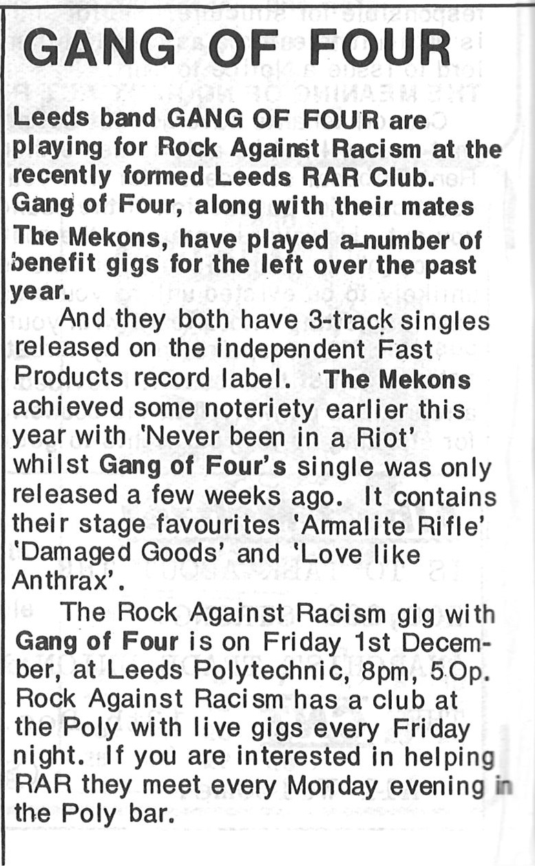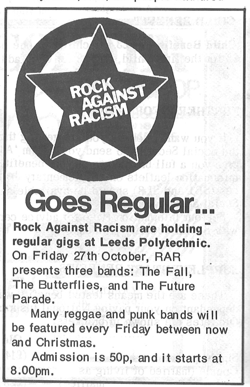 Such targeting of RAR supporters in Leeds does not seem to have dissuaded the movement, however, nor those bands associated with it. An LOP advert in October of 1978 reports that the gigs would now be held on a regular, weekly basis and that the biggest name in town would be joining them just a few weeks later. Many of the bands active in Leeds during this time have been regularly cited by their musical descendants as formative influences: individual battles may have been won by the far-right, but the RAR could claim the broader war.