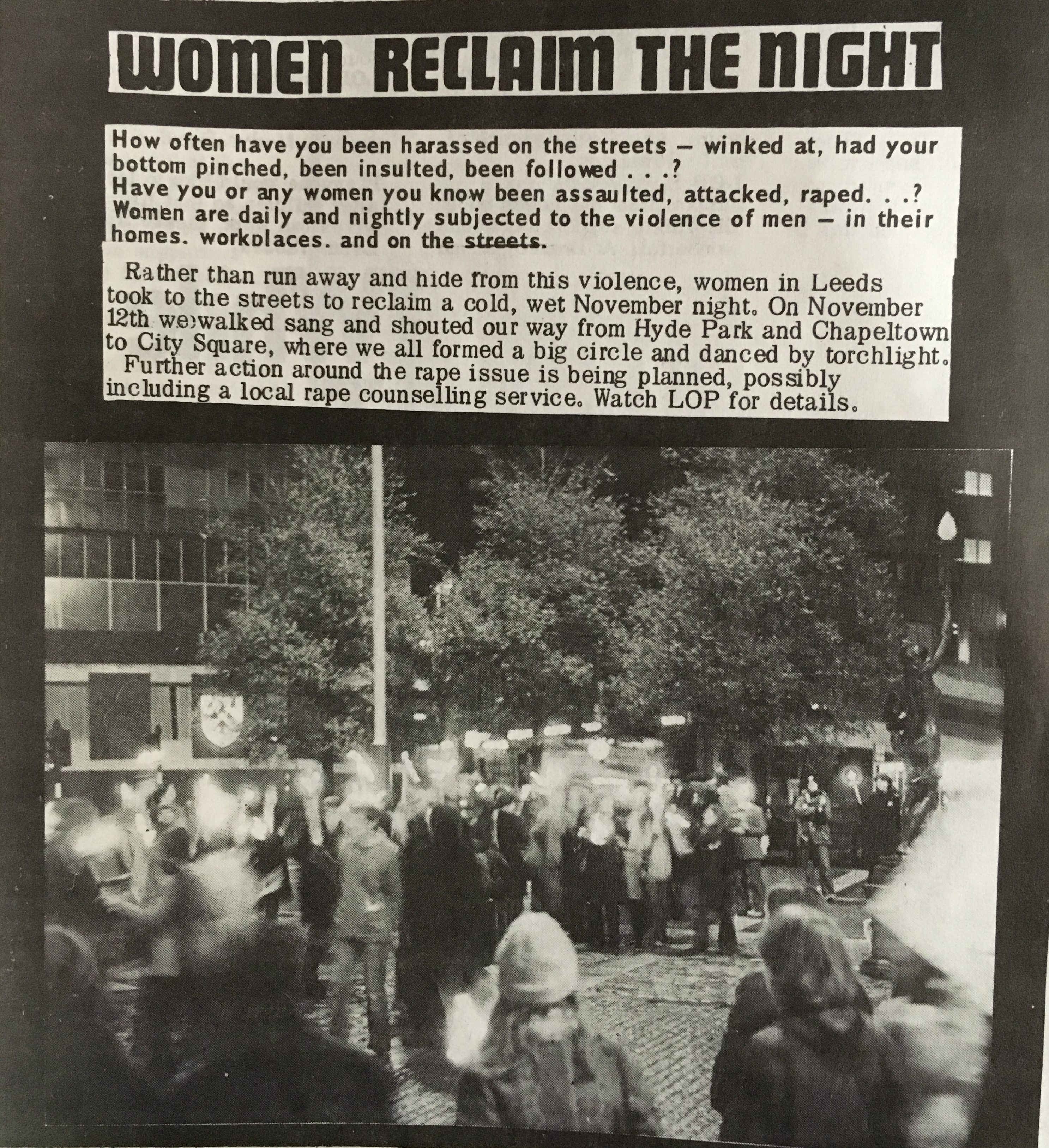 The LRFG organised the UK’s first Reclaim the Night march in November 1977, a direct response to the cultural and legal framing of the so-called ‘Yorkshire Ripper’ assaults and murders of women, in particular the police ‘advice’ that women should remain inside to ‘guarantee’ their own safety. The march turned the focus back onto the behaviour of male perpetrators, widening the context to include a spectrum of criminality on which the ‘Ripper’ attacks were the most extreme.