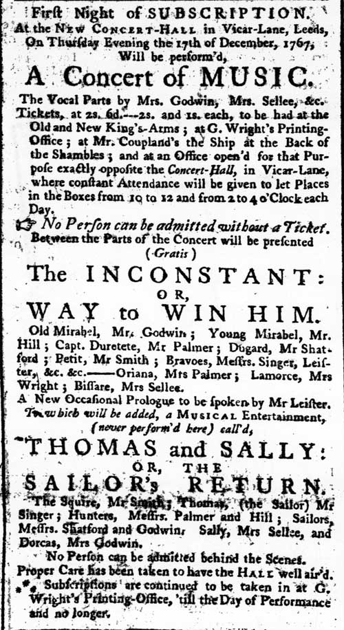Either way, by the close of 1767 the Rose and Crown’s dominance as the venue for theatrical performances was ended, when the New Concert-Hall opened on Vicar Lane in December of that year (the exact location on Vicar Lane is unknown):