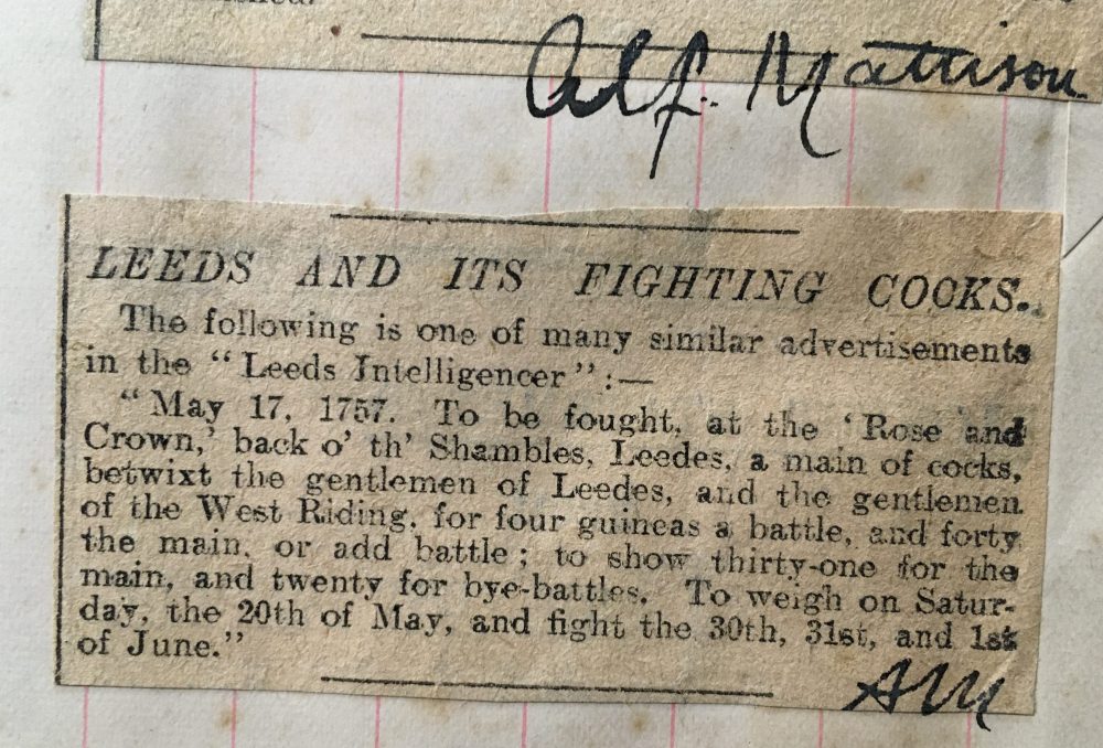 Mattison also records, in another cutting from the same ‘Chronicles of Old Leeds’ series that the Rose and Crown Inn “was used for theatrical productions – usually without Royal Patent, the licence to perform.” That is to say: the concert room was supposed to be for musical entertainment only, with the Royal Patent required to perform plays for profit. In a pleasing display of the Yorkshire entrepreneurial spirit, however, the publican of the time got round this by only charging the audience for their seats for the music; the plays were free.