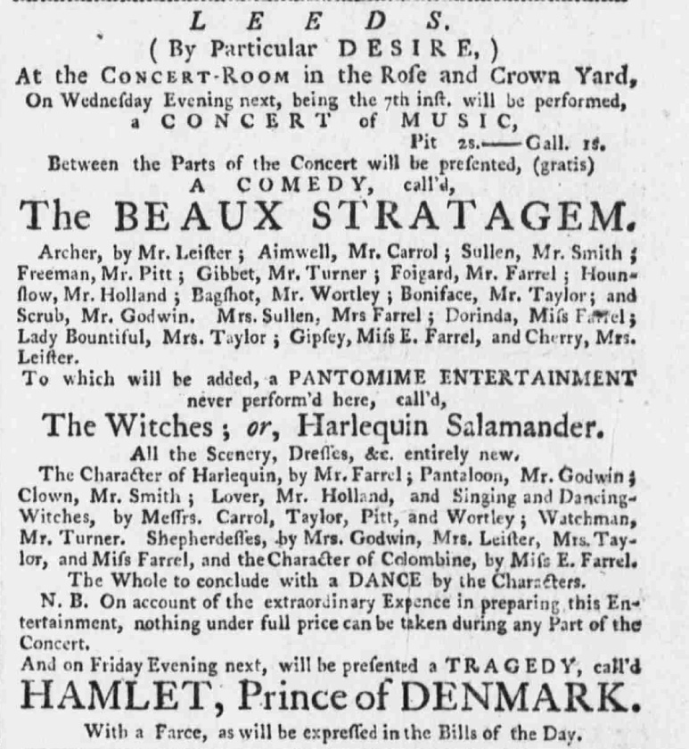 On the date in question, then, the play being performed was The Beaux Stratagem – to which was “added, a PANTOMIME ENTERTAINMENT never perform’d here, call’d The Witches; or, Harlequin Salamander ” – the same title we find in the 1772 performance, when it was also said to have been “never perform’d here”…!