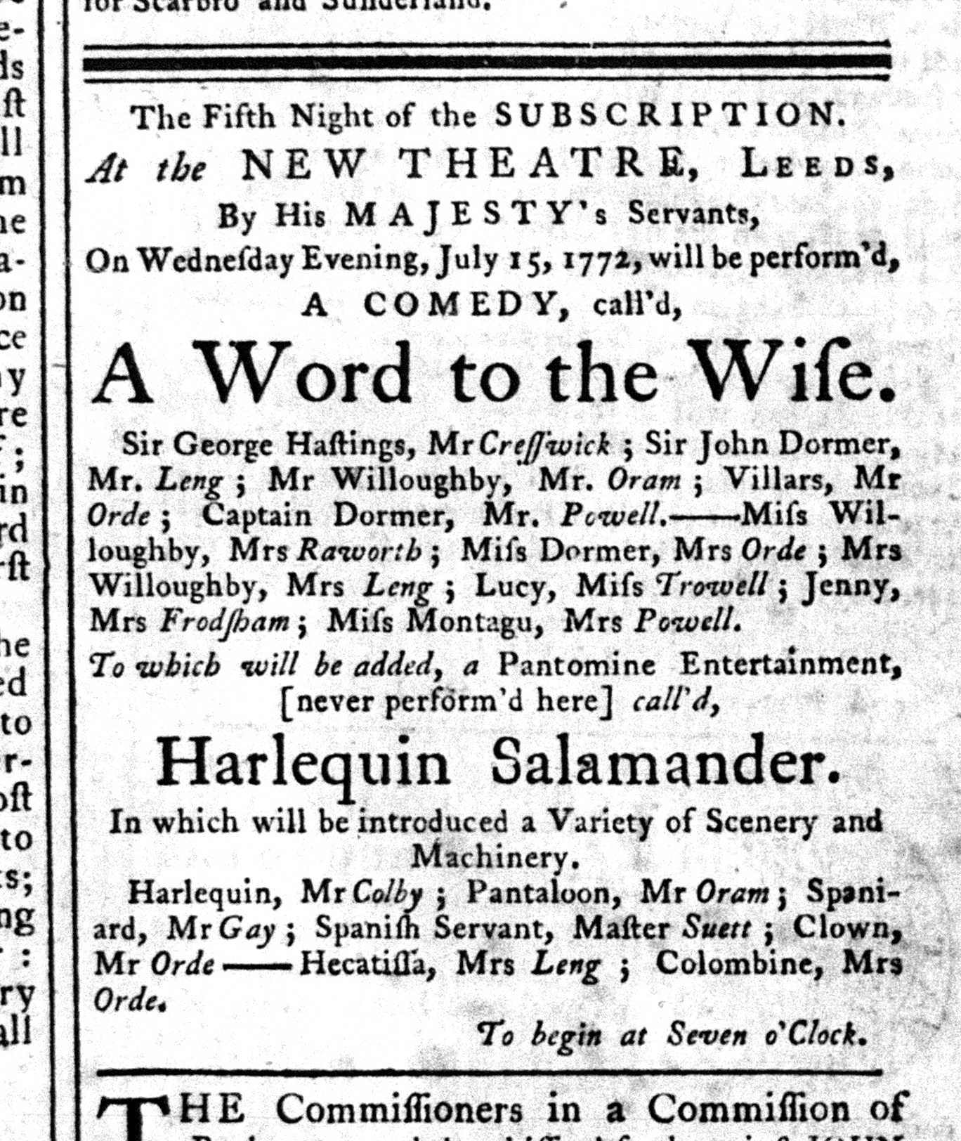 Strangely, a manual search of the Local and Family History local newspaper-microfilm collection threw up no mention of that particular performance – but the Leeds Intelligencer did record a performance of a pantomime called ‘Harlequin Salamander‘ [italics added] on July 14, 1772: the first advert or mention of any pantomime found in the local press during that search. It’s possible, of course, that the two plays are one and the same – Mattison does note that Sorcerer existed “with variations in title” between 1772 and 1793.