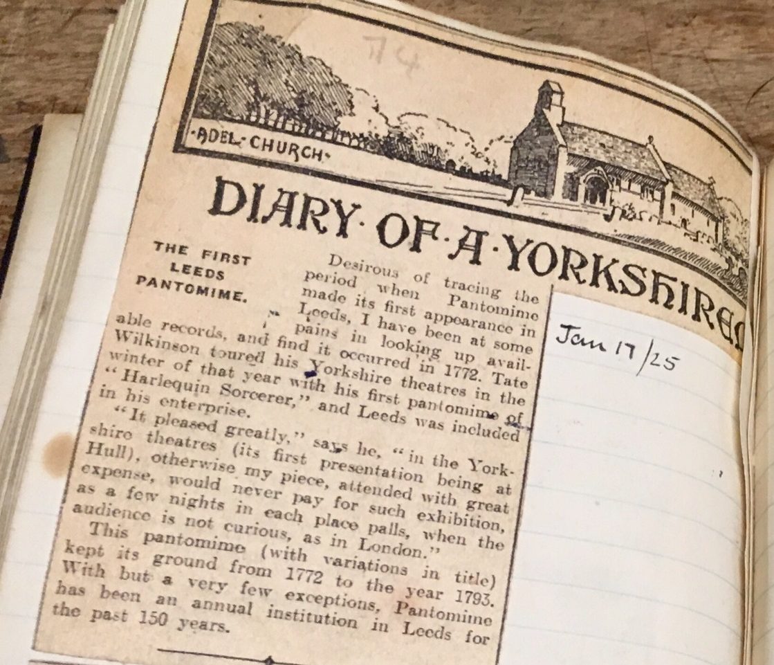 That cutting, then – from Mattison’s regular ‘Diary of a Yorkshireman’ series in the local press – states that the first pantomime performed in Leeds took place in 1772, was entitled ‘Harlequin Sorcerer’ and was performed by the company of the legendary Tate Wilkinson at his The Theatre on Hunslet Lane, just one year after it opened.