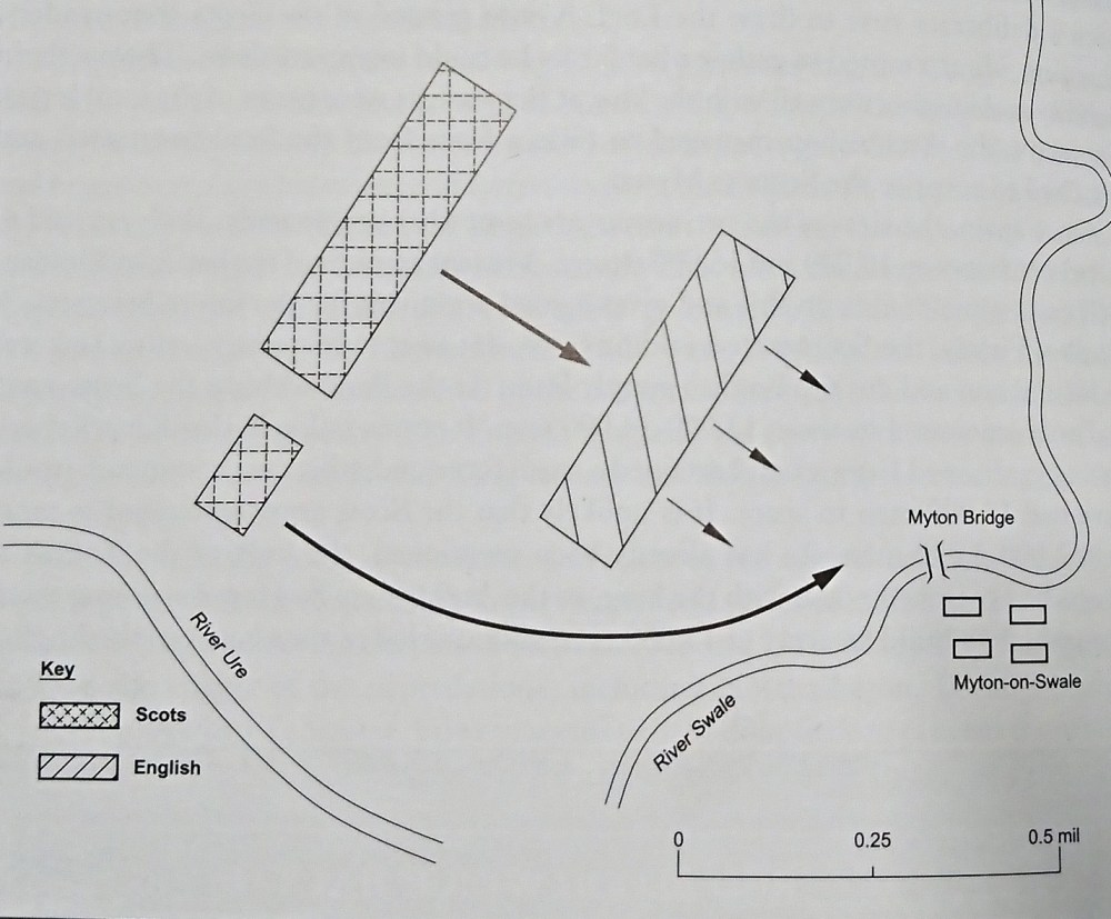 Archbishop Melton, of York, knowing the mayhem that the raiding Scots had caused and their intention to take Queen Isabella hostage, attempted to raise an English army to defeat the Scots. The Archbishop’s problem was that Edward II had taken the majority of Northern Nobility and soldiers to Berwick. Undeterred, the Archbishop of York was able to raise a substantial English army mainly made up of English townsman and three hundred white-clad monks. The English plan was to ambush the unaware Scots, however the battle hardy and experienced Scots knew the English were coming and prepared accordingly.