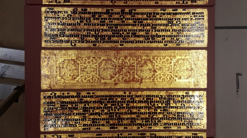 These manuscripts were written on a variety of materials. This might be palm leaf, stiffened cloth, or gold, silver, metal or ivory sheets. These are then coated with lacquer and gilded decoration. It is sometimes claimed the boards were “made out of the putsoes or dresses of the Kings of Burmah”.