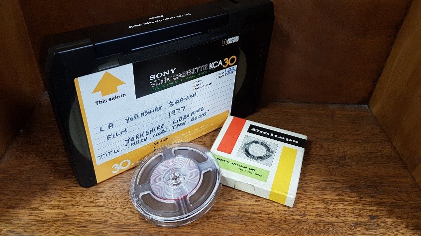 The Special Collections here at Leeds Central Library hold a number of video and cassette tapes (but nothing to play them on!) These include items such as six reels of sound recordings of the twinning ceremony of Leeds and Dortmund, in 1969, and Children’s games, songs and customs in Leeds by author and poet Rowland Kellett. The picture shows a ‘Videocassette’ from 1977. A Library Association Yorkshire Branch video, ‘Much More than Books’, and an EMI ‘Magnetic Recording Tape’ of the opening by the Queen at the Centenary of the Leeds Music Festival on 17/18th October, 1958.