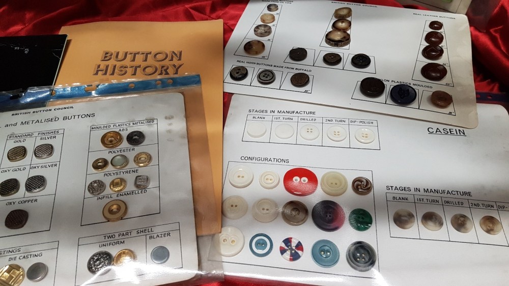 Seen here are a few of the ten sample cards contained within a lever arch folder compiled by the British Button Council and dating from the 1950s. These cards show different colour and pattern configurations for casein, metal and metalized, leather, horn and nylon plastic buttons as well as examples examples of the separate stages of manufacture.