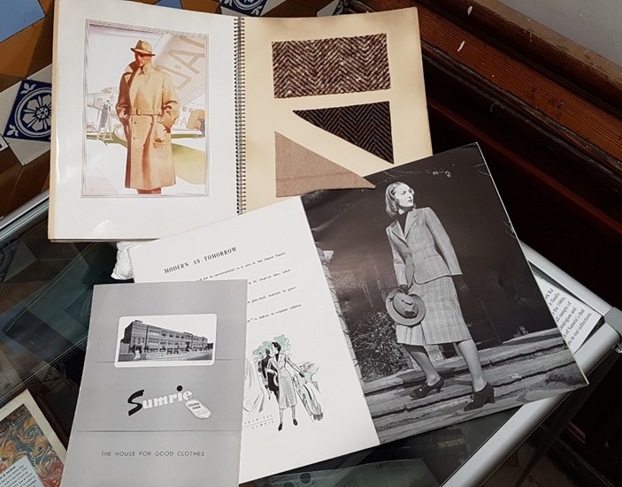 Charles and Carl Sumrie, born in the 1890s started a tailor’s shop in Leeds during the First World War. By 1920 the firm C. & M. Sumrie had been established and was producing high quality garments. ‘House of Sumrie’, first operated from two adjoining terraced houses on Claypit Lane. In 1932 they moved to their showpiece building, Sumrie House in York Road where they remained until the firm was eventually bought out in 1982. After more than sixty years C. & M. Sumrie ceased to exist. Leeds Central Library has a number of items related to the company including clothing catalogues, pattern books, correspondence and ephemera – several of which contain original pieces of sample textiles.