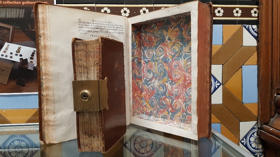 The first item is a copy of Nouveau Cours de Mathematique, by Bernard Forest de Bélidor (1725). This book has at some time been hollowed out. It contains a note that suggest that at some time the space was occupied by another unnamed book that seems to have disappeared long ago. One can only guess at what the unknown book was and why it was important enough to hide it within another book. Did it perhaps record the secret meetings of two lovers? Or was it merely to hide something as mundane as an accounts book? Was it really a hiding place for jewellery or a gun perhaps? One could really speculate forever.