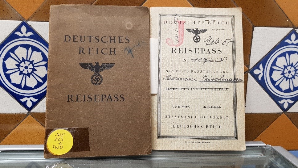 Donated to the library in 1984 these two German passports belonged to Mr Karl Ott and Miss Hermine Frischmann, two German Jews who were among the fortunate few who managed to escape to England where together they landed at Newhaven on 22 February 1939. The visas in the passports clearly show the route they had to take through Europe in order to reach safety. Earlier, on October 5, 1938, the Reich Ministry of the Interior invalidated all German passports held by Jews. These had to be surrendered and would only become valid after a bold letter “J” – Juden – in red had been stamped on them.