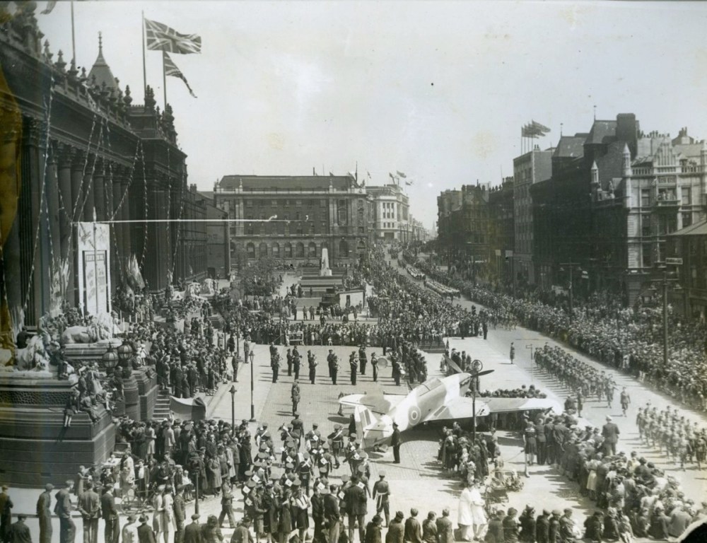 The Wings for Victory Weeks were held across the country in 1943, from March onwards, to raise money by, among other ways, encouraging civilians to save with War Bonds. In Leeds the event was held 26 June – 3 July of that year where there was a public appeal to raise a minimum of £5 million pounds to provide aeroplanes for the war effort. The people of Leeds did more than that and raised £7, 203, 768 – “Representing the cost of 100 x 4 engined bombers & 200 Fighter planes.”