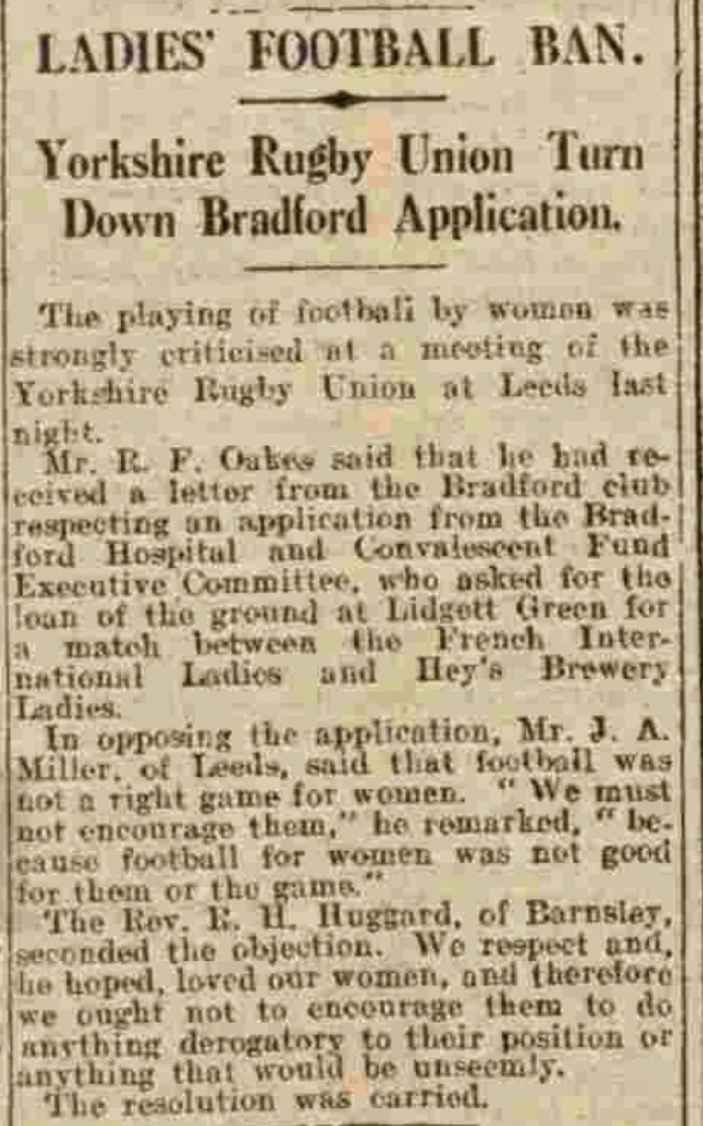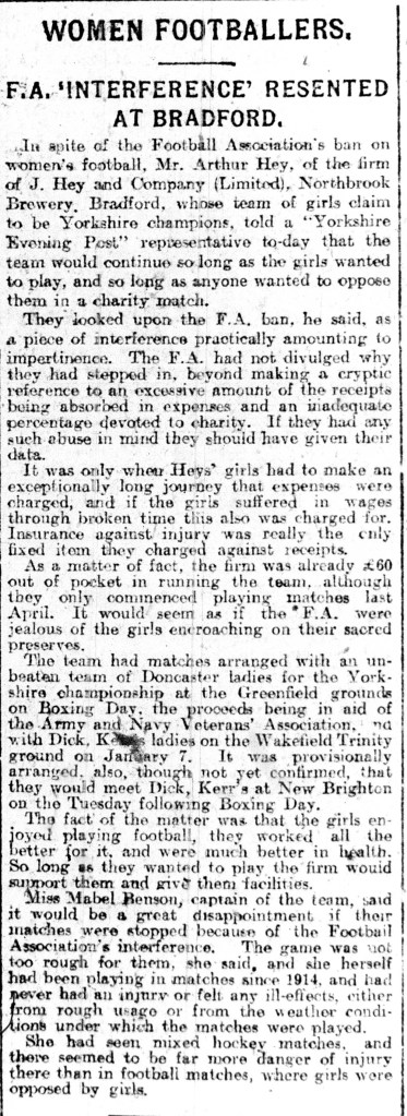 The Yorkshire Evening Post published an interview with Hey’s Brewery owner Arthur Hey. Arthur’s anger is apparent as he said that the FA had given no reasoning for the ban except for the ridiculous notion that the gate receipts were not going to the charities. Hey’s Captain Mabel Benson saw the FA’s action as nothing more than ‘disgraceful interference’ and for no real reason. Mabel finished the article saying that she had been playing football since 1914 and had never received an injury where women’s hockey players were regularly injured, and yet no ban was placed upon them. The injustice that Arthur Hey and Mabel Benson were feeling strongly comes across in this article.