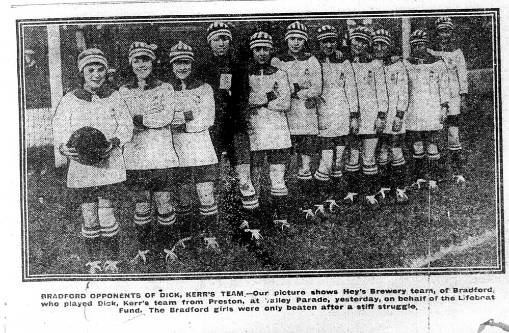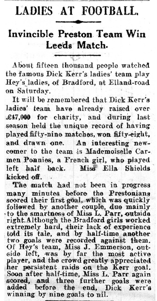 This Leeds Mercury match report states that despite Hey’s high work rate and passion their inexperience, having only been formed a couple of months previous, showed as they were defeated 9 – 0 by Dick Kerr’s team. The attendance for the match was said to be around fifteen thousand spectators, a massive amount of supporters for a women’s football match, or any football match in the 1920’s. The prospect of seeing Dick Kerr’s high profile team play was very popular in West Yorkshire.