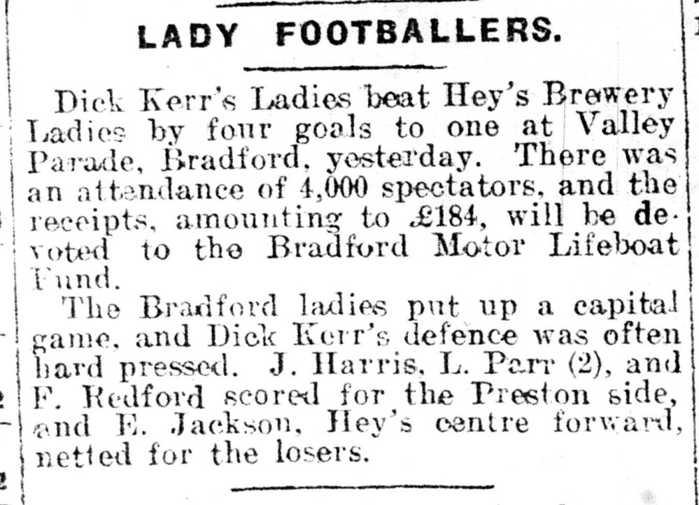 This time a more experienced Hey’s bravely took on the might of Dick Kerr’s team and were only defeated 4- 1, with Hey’s solitary goal coming from centre forward E. Jackson. After only being created a few month earlier and the heavy defeat in the previous charity match, this 4 – 1 defeat showed the real progress that Hey’s were making in late 1921. More importantly over four thousand spectators travelled to see this game and the match raised £184 for the Bradford Motor Lifeboat Fund.