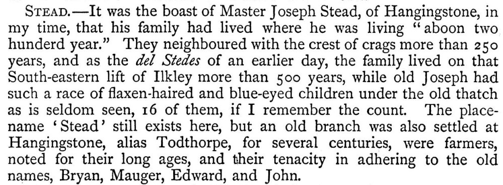 I found the Leeds Libraries’ photographic archive of Leeds and looked to see if there were photos of any of my relatives houses; there were Steads throughout Farnley, Armley, Holbeck, Bramley and Wortley – though the family actually originated in Ilkley, as this extract from the 1885 book Ilkley: Ancient and Modern shows: