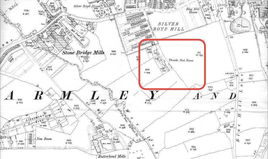 Below is a photo of Throstle Nest House: very impressive sitting up on top of the hill like that – I think it’s long gone, sadly, and the location is now a school.