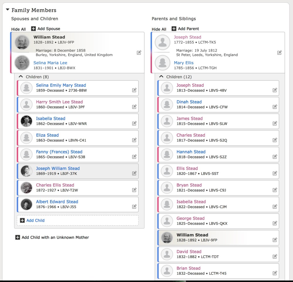 This Joseph Stead was my Gt, Gt, Gt, Grandfather; Gt, Gt, Grandfather William was one of those 16 children, all of whom were basically farmers – and many of whom left Ilkley and moved to the Wortley area, where my Gt Grandfather, Joseph William Stead, was born in Blue Hill Lane.
