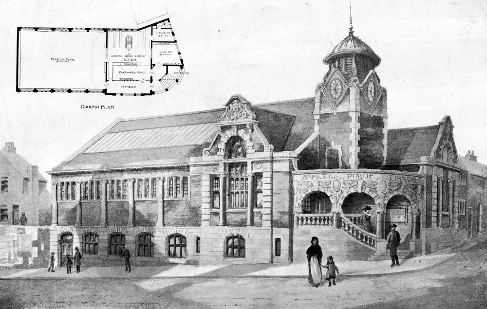 23rd March 1900 Armley Library, architect Percy Robinson’s design and drawing. The library opened to the public in 1902, it was the first purpose built library in Leeds. A lending department, reading room and separate ladies room were provided. Later, the basement area was a childrens library. The building has had a total refurbishment and houses various council services, including library service under the title of a One-Stop-Shop.