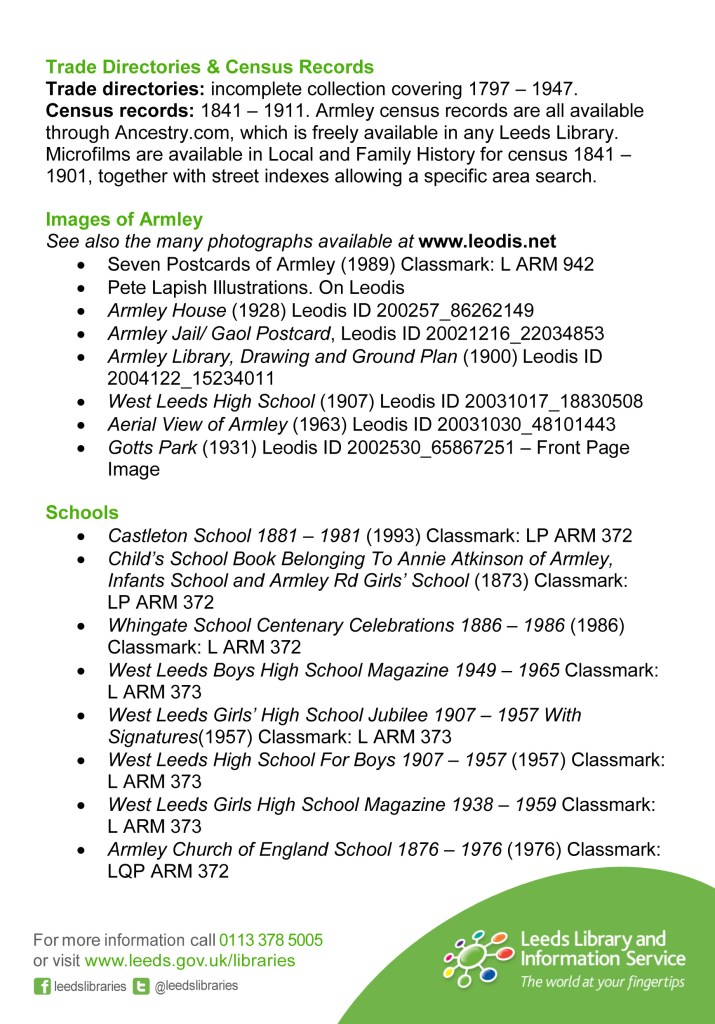 That is how you can use the new Armley Research Guide to find some exceptional images of Armley. This is the start of a new series which will look into items from the Leeds Central Library Collection about Armley’s history.
