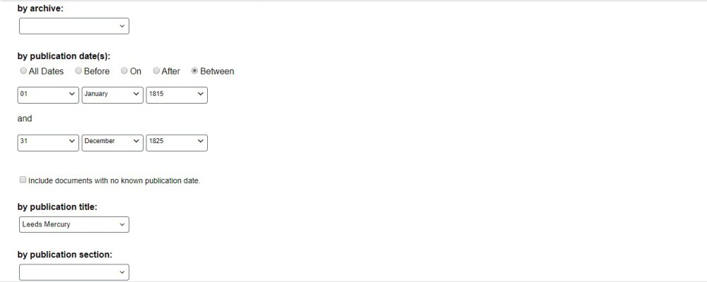 For this example I am going to show how to find an obituary for a R. Mangnall who died in 1820. To find the obituary for R. Mangnall, I searched simply Mangnall Obituary and the chose the dates 1815 – 1825, as I was unsure when the death happened it was useful to give a wide range of dates. I then most importantly chose to only look for newspaper articles that were published in the Leeds Mercury, as I was only looking for newspaper articles from the Leeds area. The Leeds Mercury is the only Leeds newspaper that is available on Nineteenth Century Newspapers.