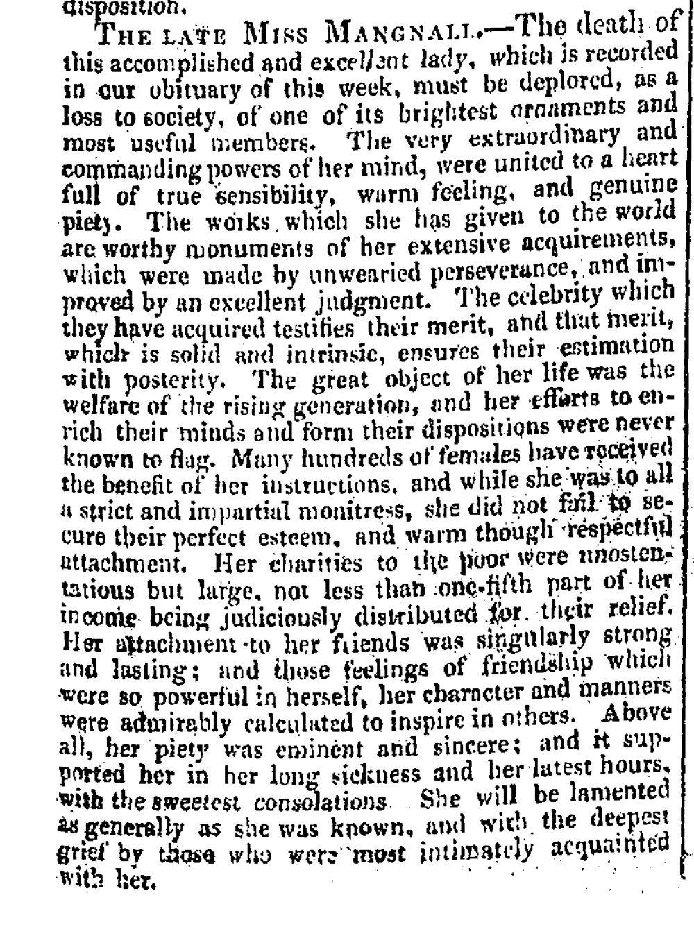 Here we have the Obituary of Miss R. Mangnall from the Leeds Mercury on the 13th May 1820. You can see how much information is in a detailed obituary. This obituary leaves the readers with an excellent impression of Miss Mangnall, calling her an ‘accomplished and excellent woman.’ This obituary gives a lot of information about the occupation and social life that Miss Mangnall had, including that she had instructed a lot of girls in her profession and devoted much of her time to charities. Finally obituaries can be useful as they often give a cause of death, in this case Miss Mangnall was suffering from problems with her lungs. As you have seen from this obituary that is only a paragraph long we have been able to have a well-rounded description of Miss R. Mangnall’s character, life and death.