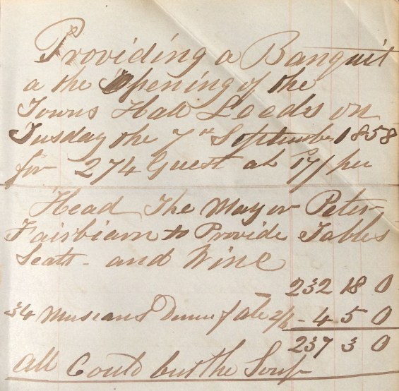 On 8 February 1850, Mr Bateson, Mayor of Leeds, was supplied with a stand up supper and tea, coffee, ices and desert for 369 people. Here the waiters include “the drunkard” and Wood provided food for the musicians as well as 20 policemen.