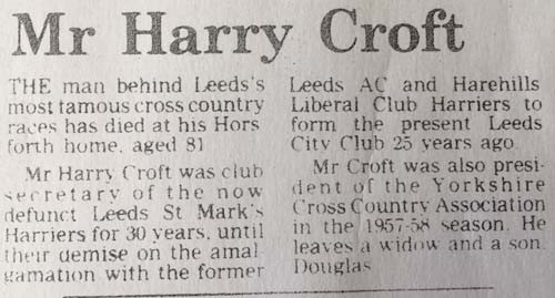 When I saw the name Harry Croft, it rang a bell, so I read further with great interest. In the mid 1950s, as a teenager I was a member of Harehills Harriers and reading this article brought back some happy memories and a few names; Eric (I think) Smith who ran in the Czech Lidice memorial marathons, Arthur Cockroft, the club Captain as I remember and the Pawson brothers, the younger of whom I was at school with, which is how I joined Harehills Harriers in the first place.