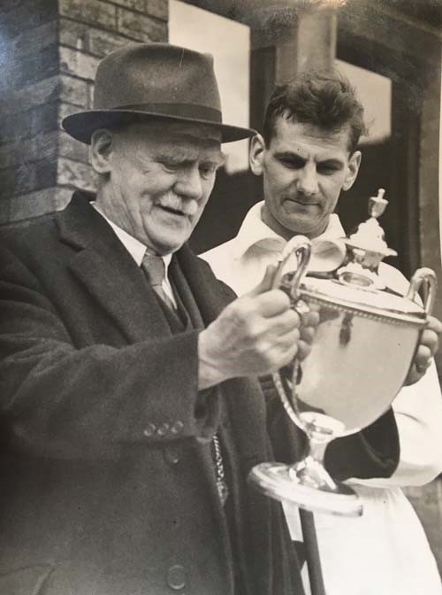 The photograph below is believed to show Joseph Fozard, as the notes read “Frank Aaron with the oldest member”, viewing a championship trophy: