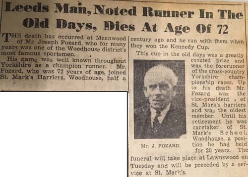 Joseph Fozard was vice president of Leeds St Mark’s Harriers up to his death in 1940 at age 72, and was a member for over 50 years. He was a champion runner in his youth, and is often referred to in reports on the club as being the oldest member, and appears in several team photographs.