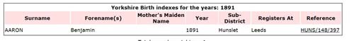 Benjamin was born on 29th June 1891 in Hunslet to George and Emily Aaron