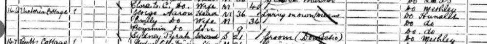 The 1901 Census below shows Benjamin living with his parents at Victoria Cottage, Methley. His father is listed as being of independent means, and they have a servant, a groom.